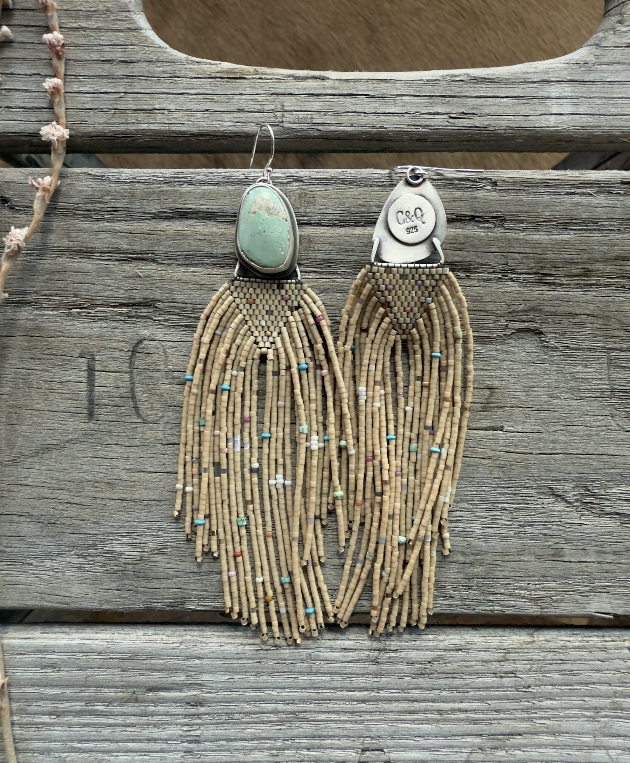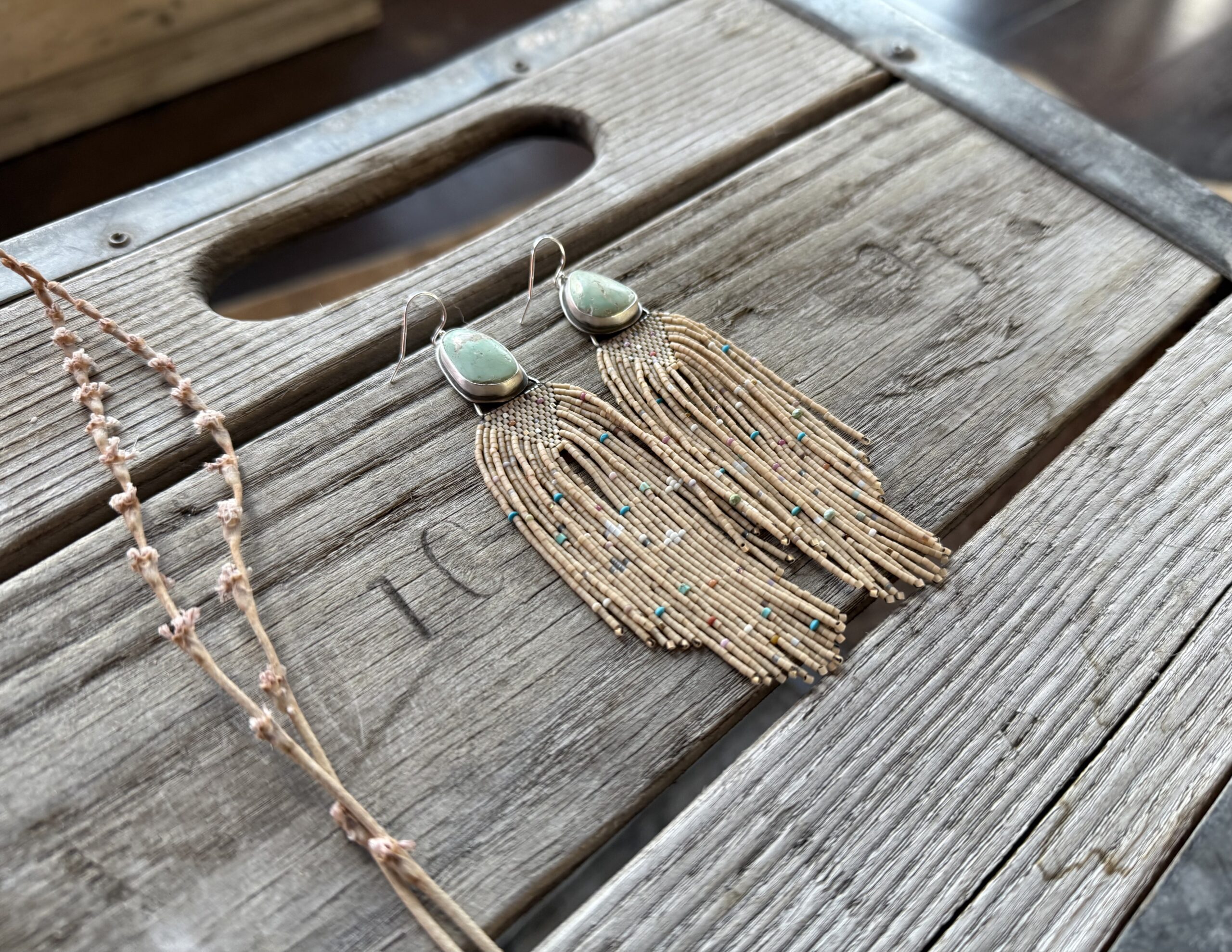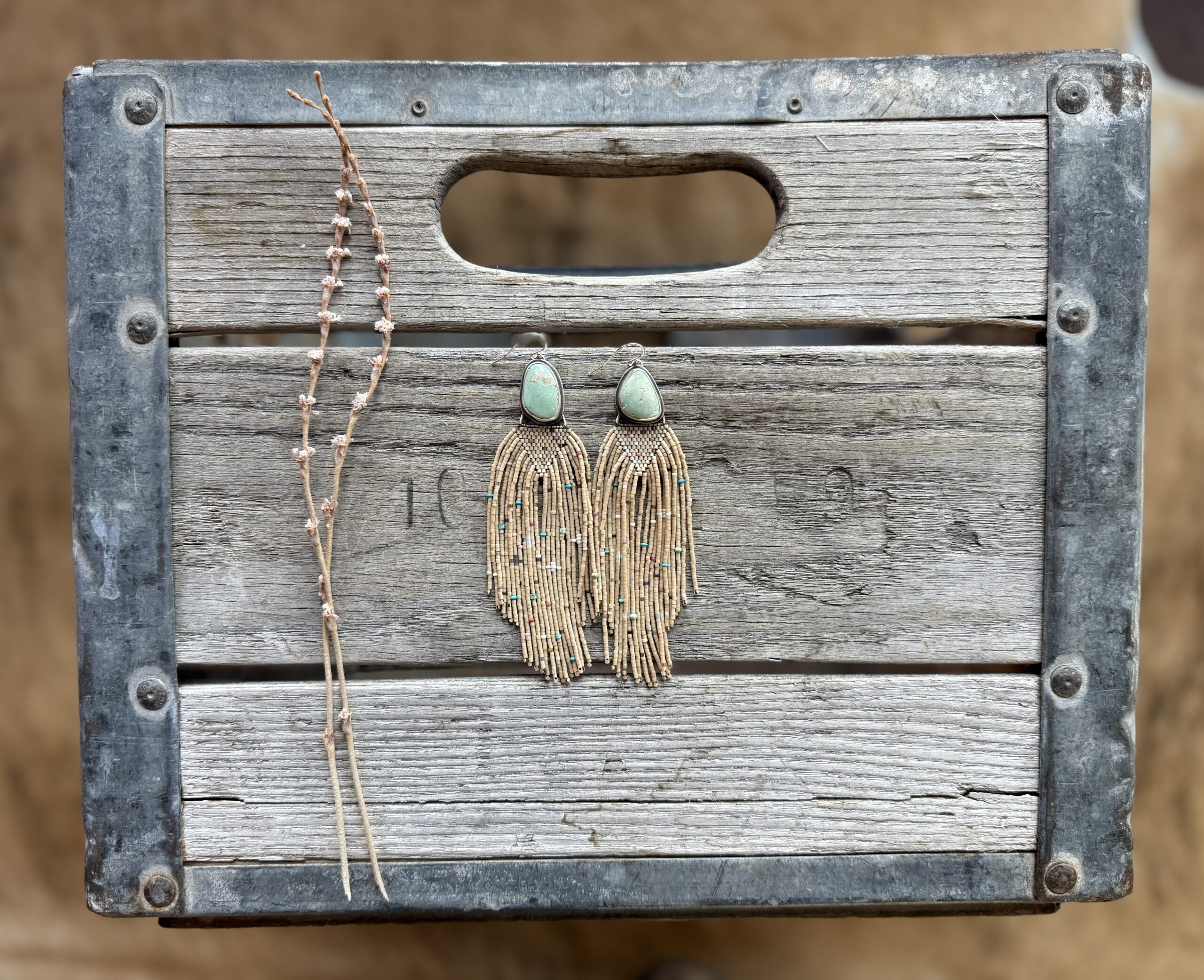 This piece is made out of size 15 Japanese glass seed beads in a light tan with turquoise accents and 24kt gold beads.