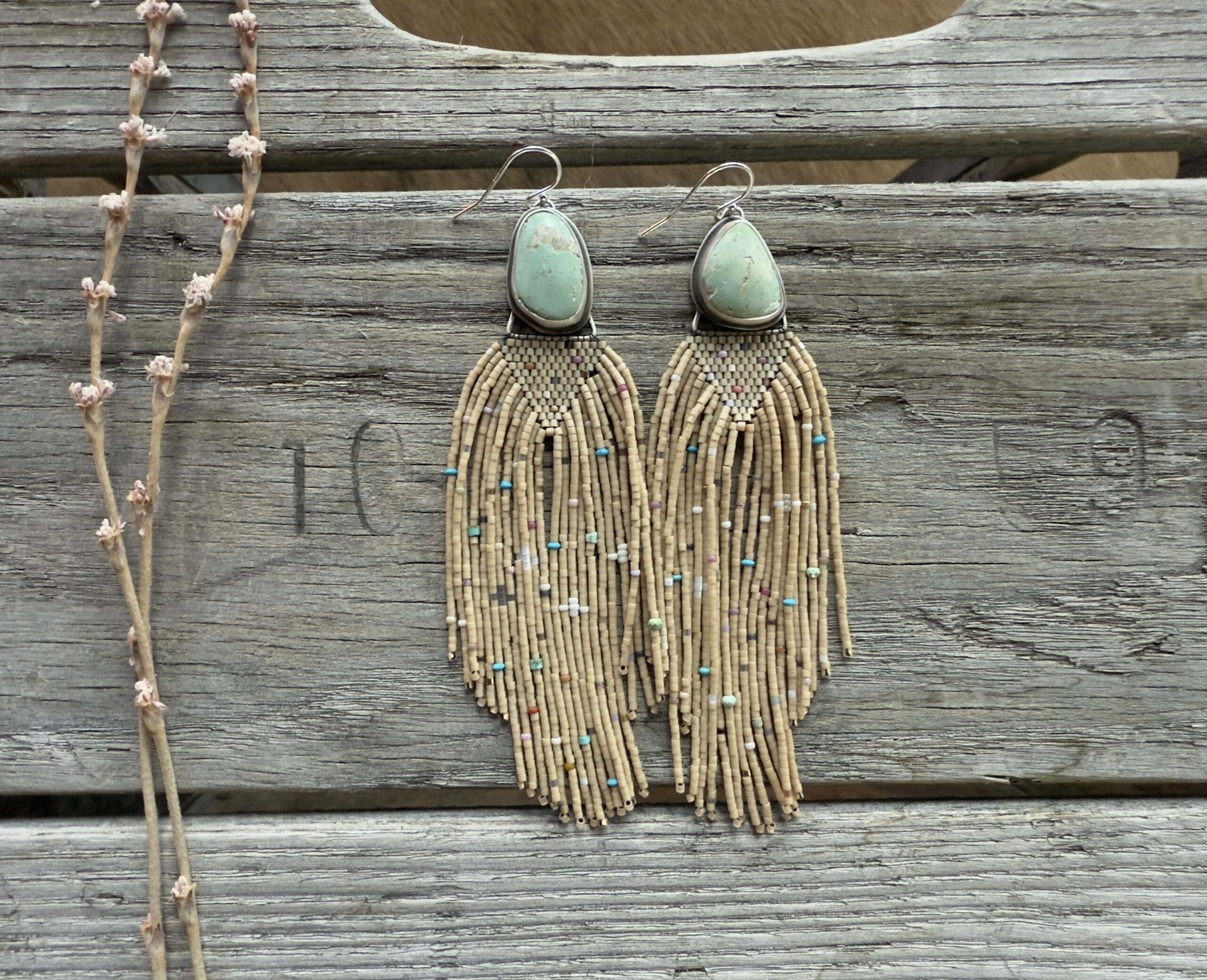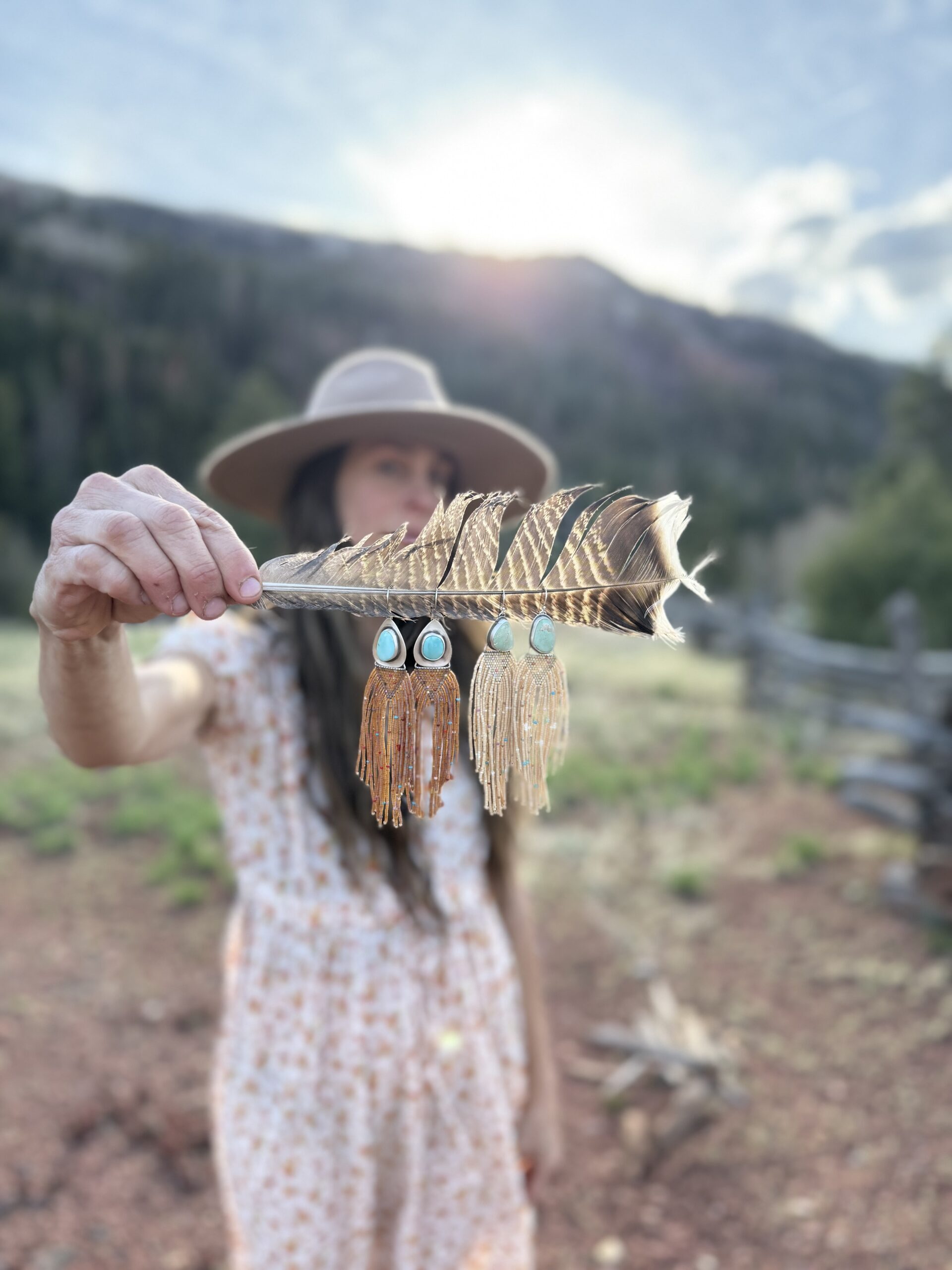 The top is a .925 sterling silver dome. The stones are high grade Butte Turquoise from Montana. These are 4 inches long and very lightweight.