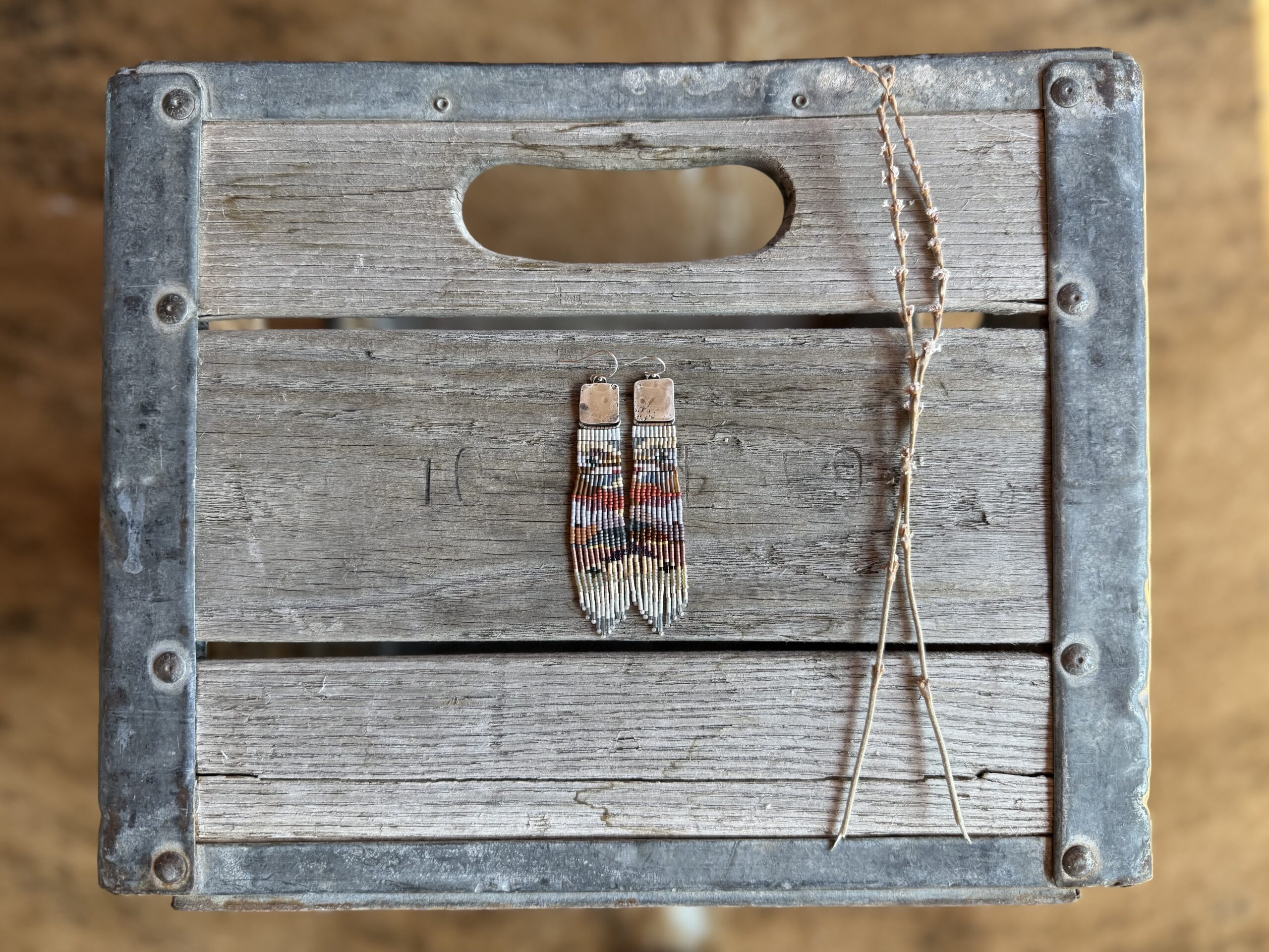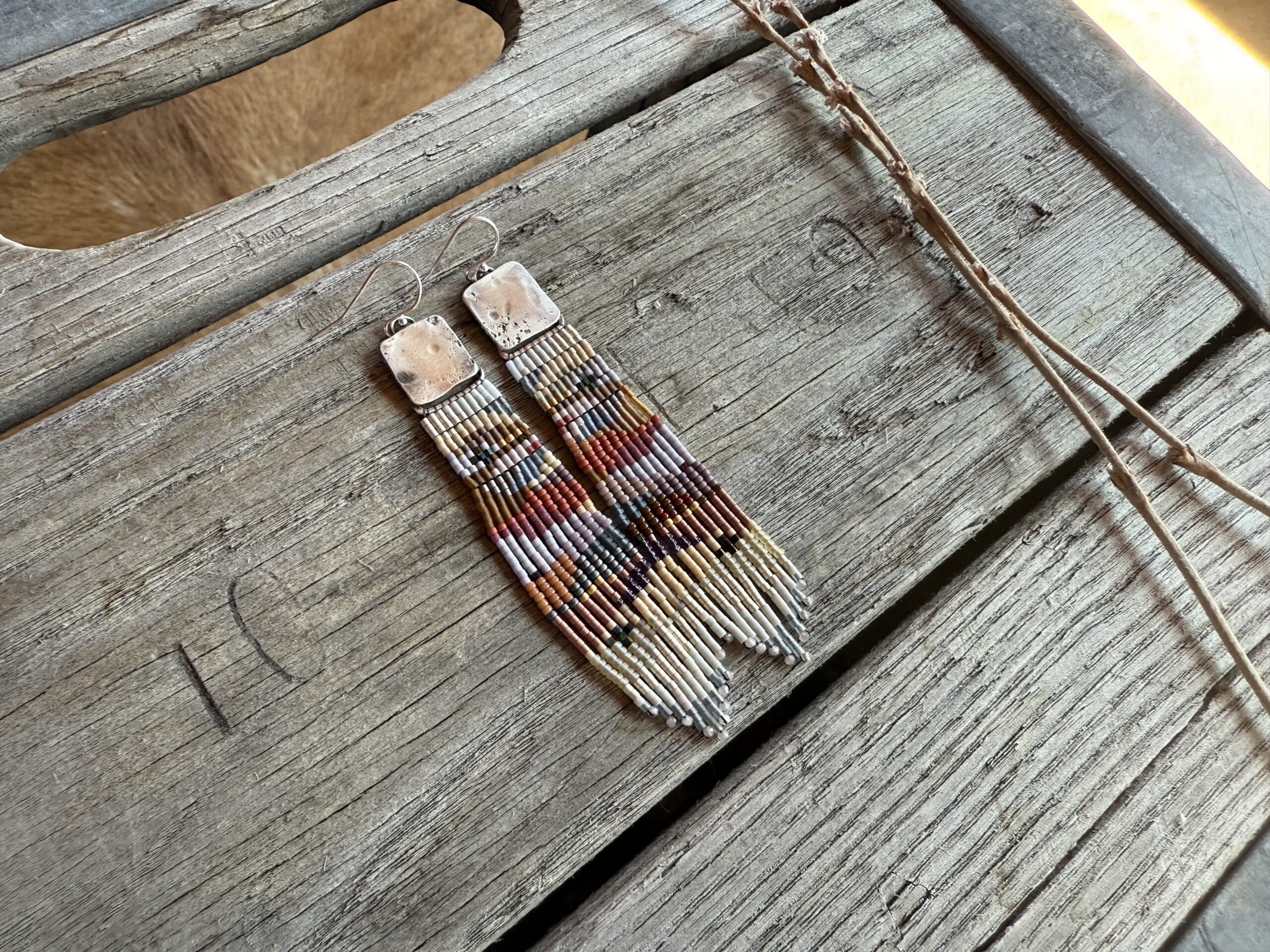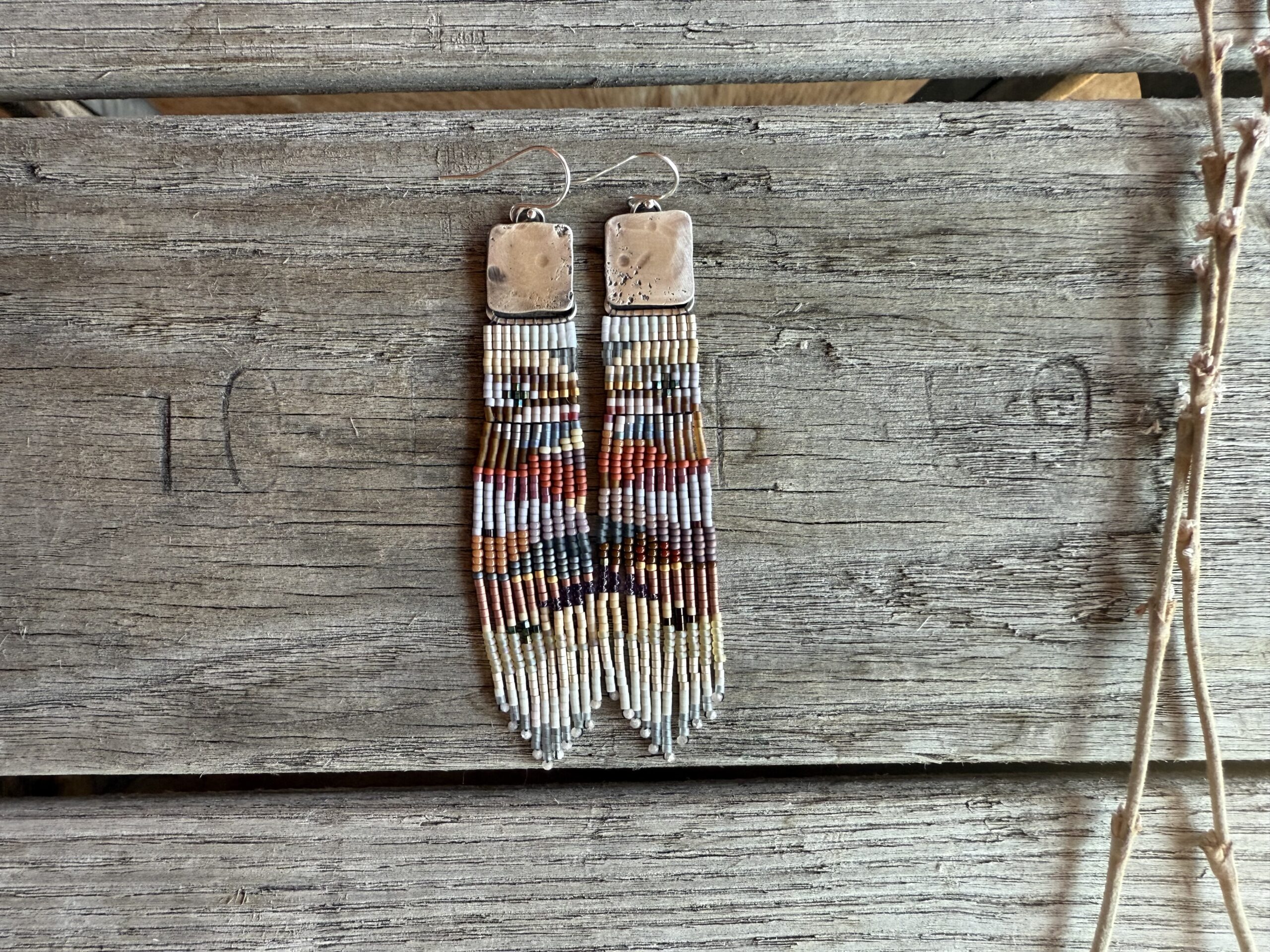 This piece is made out of size 15 Japanese glass seed beads in canyon inspired tones with 24kt bead accents. These have a distressed sterling silver dome. There are small star shaped accents throughout the beads.