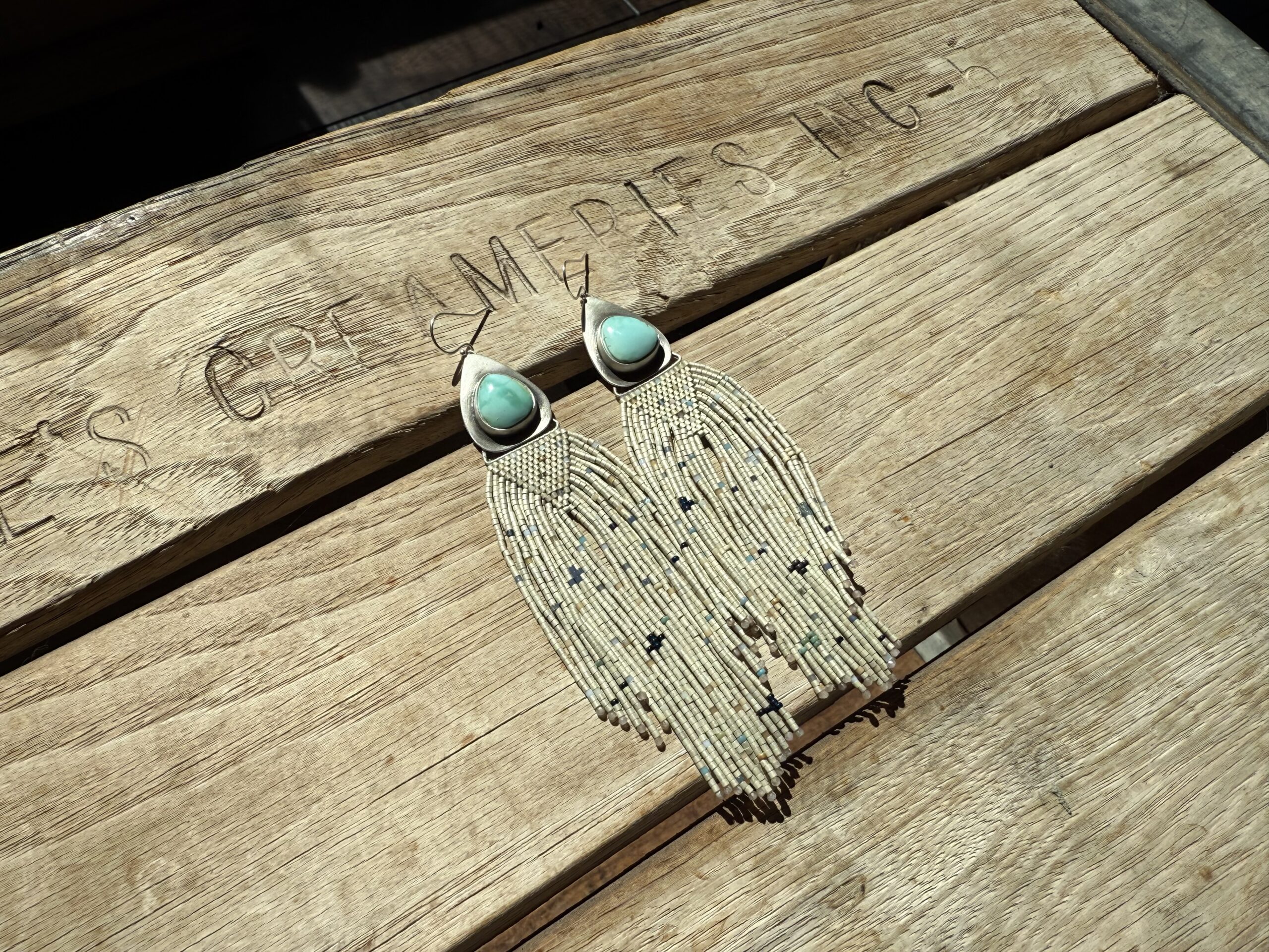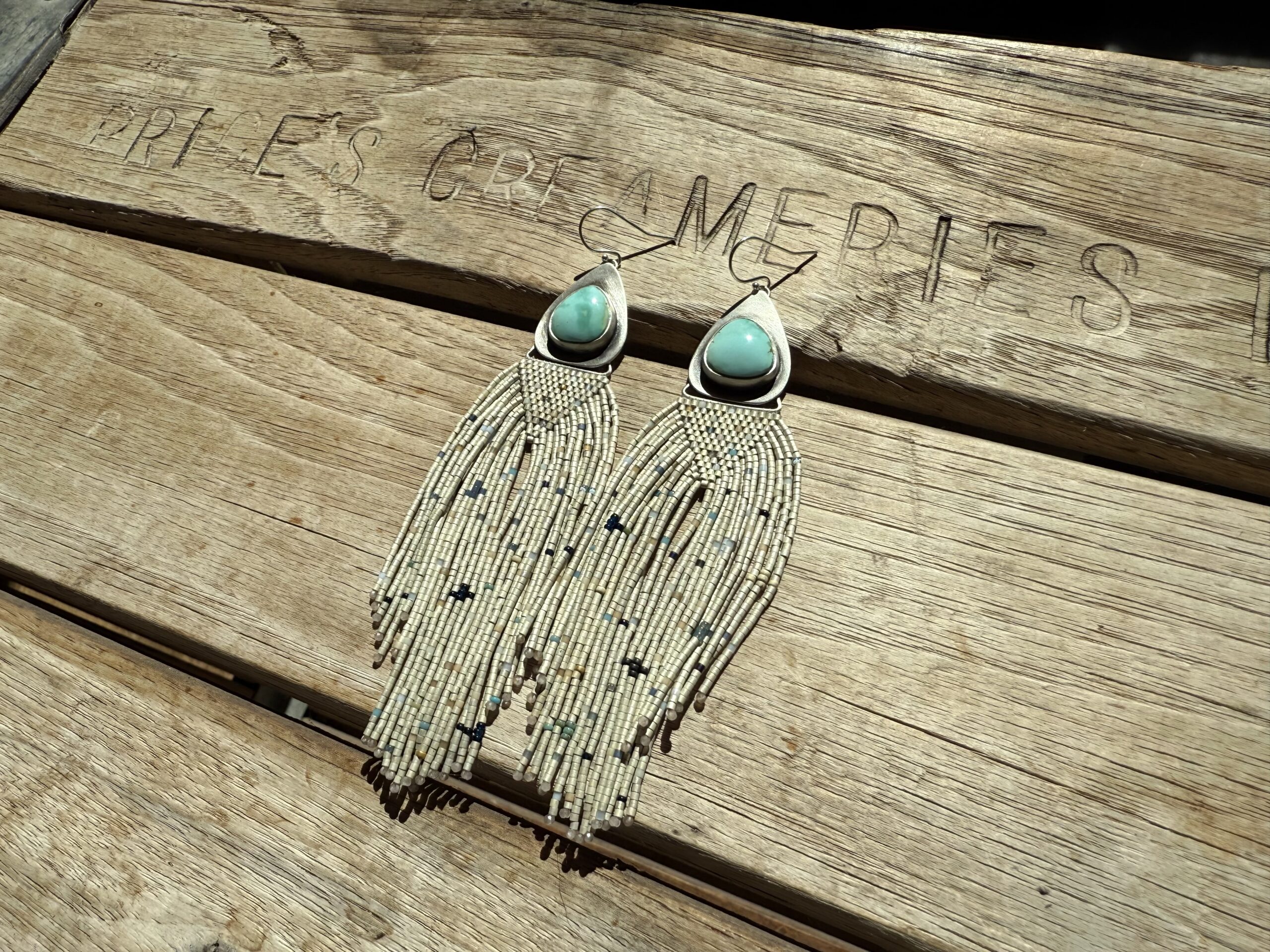 The top is a .925 sterling silver dome. The stones are high grade Royston turquoise. These are 4 inches long and very lightweight.