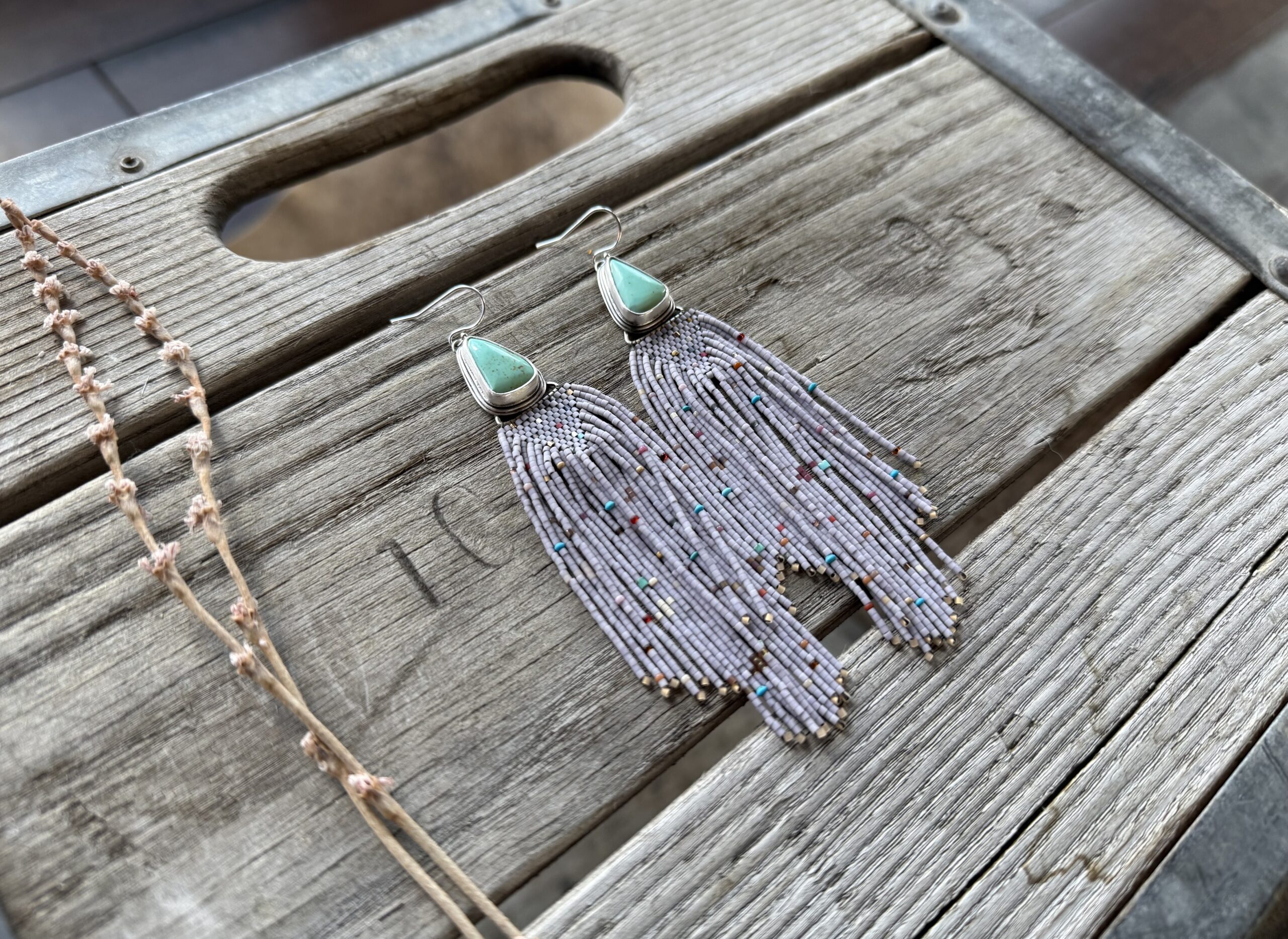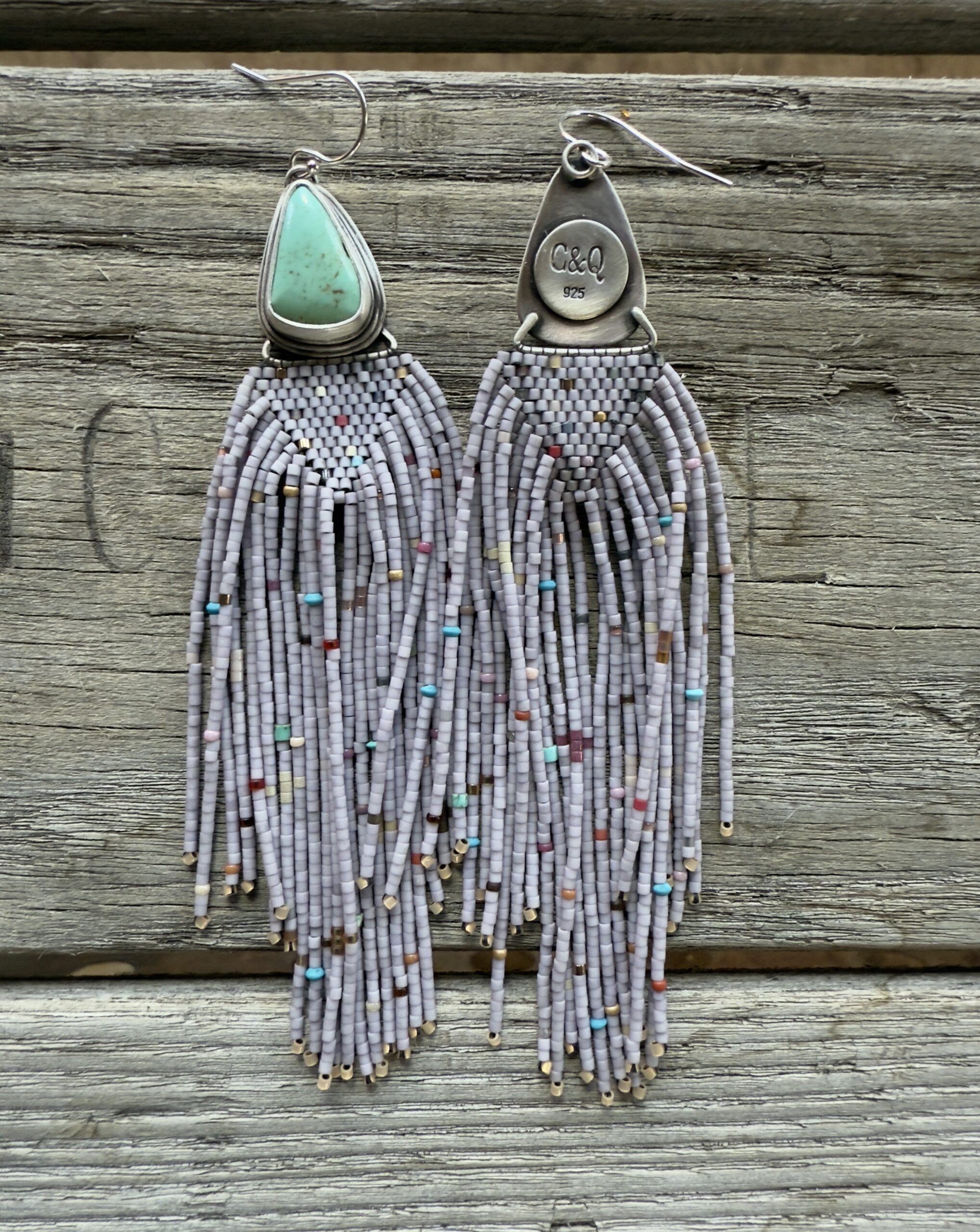 This piece is made out of size 15 Japanese glass seed beads in a lilac color with turquoise accents and 24kt gold beads.
