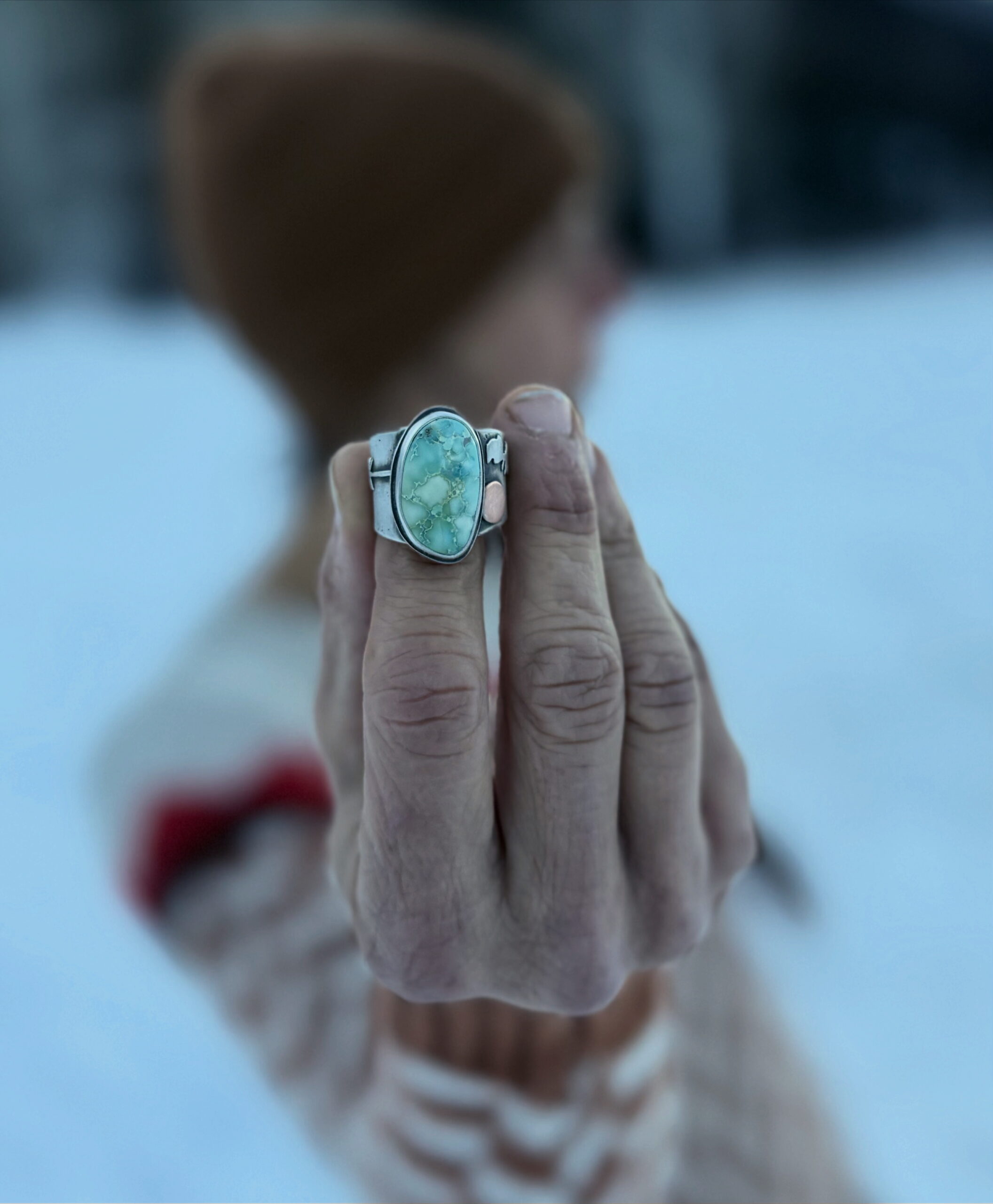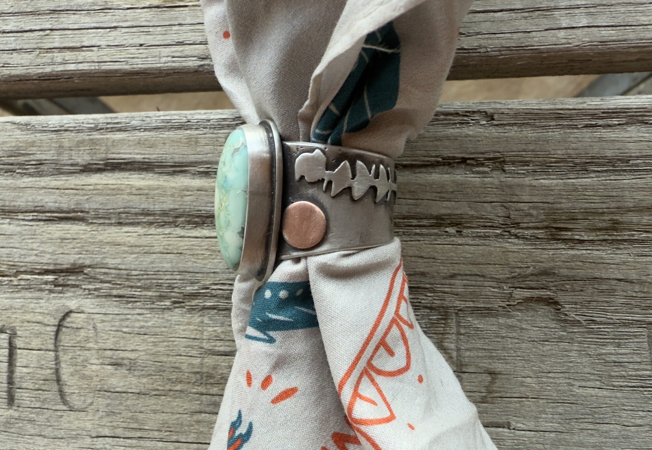 This piece is made out of 20 gauge .925 sterling silver with a high grade hand cut Palomino Variscite stone.