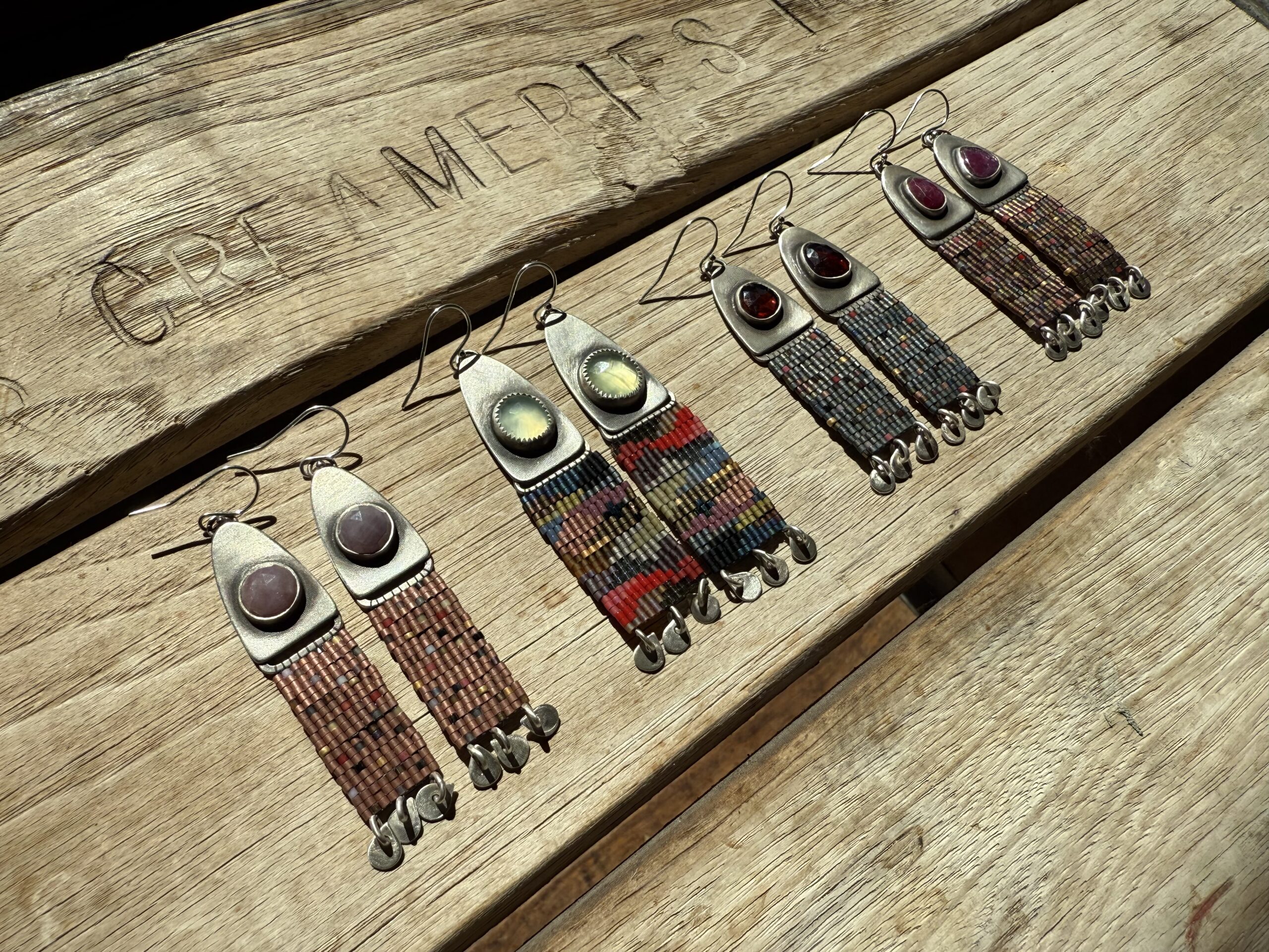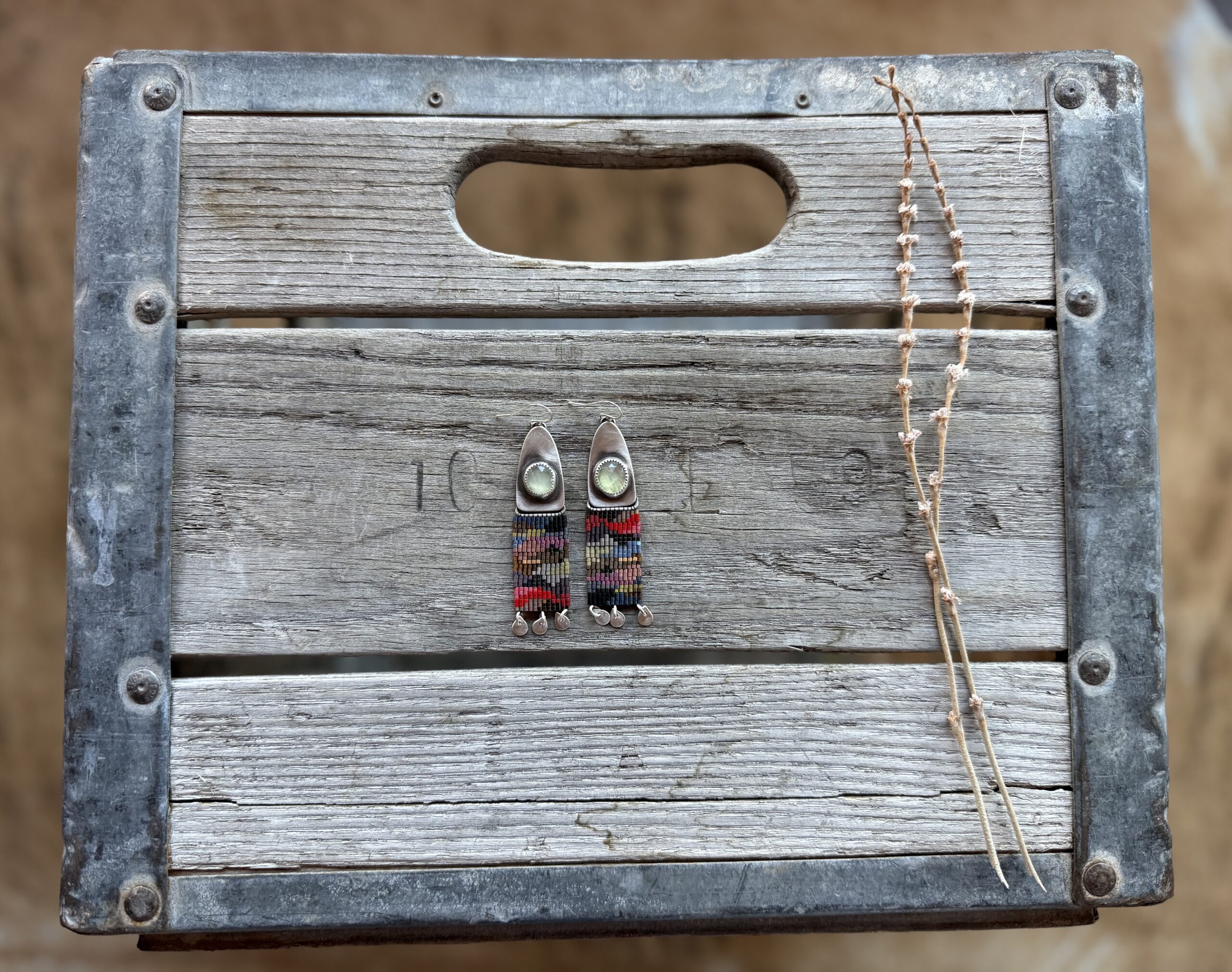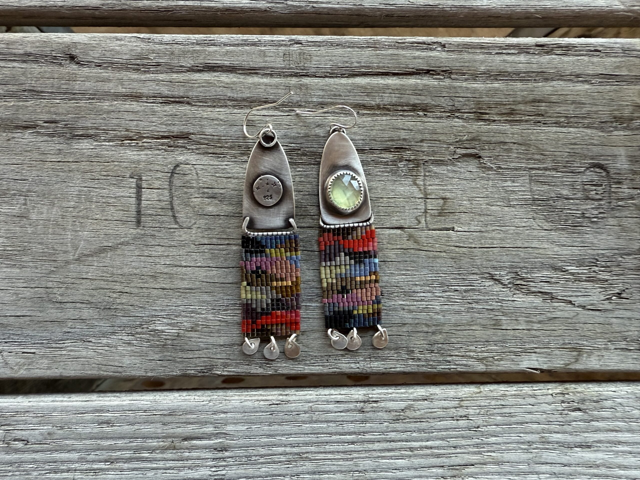 This piece is made out of size 15 Japanese glass seed beads in dark canyon tones with a sterling silver dome with rustic Prehnite rosecut stones. This pair has hand cut and shaped silver fringe on the bottom. These are light weight and fun to wear.