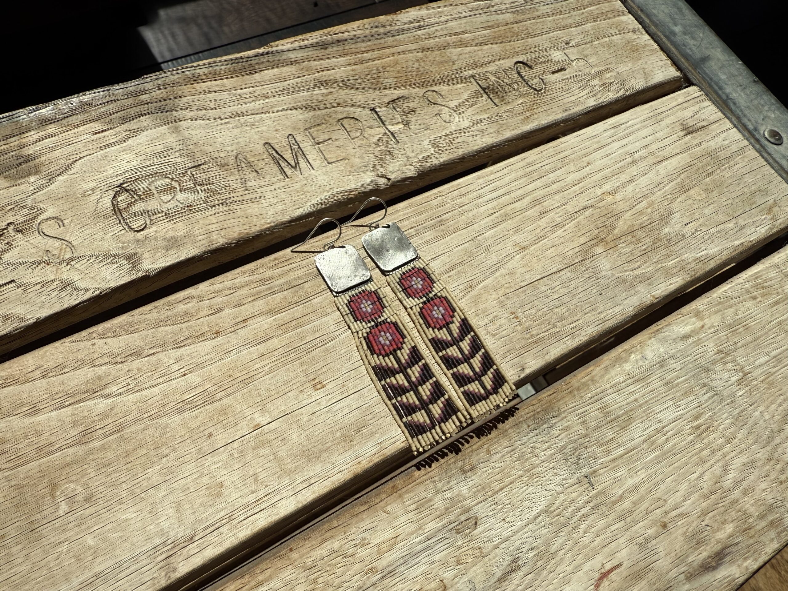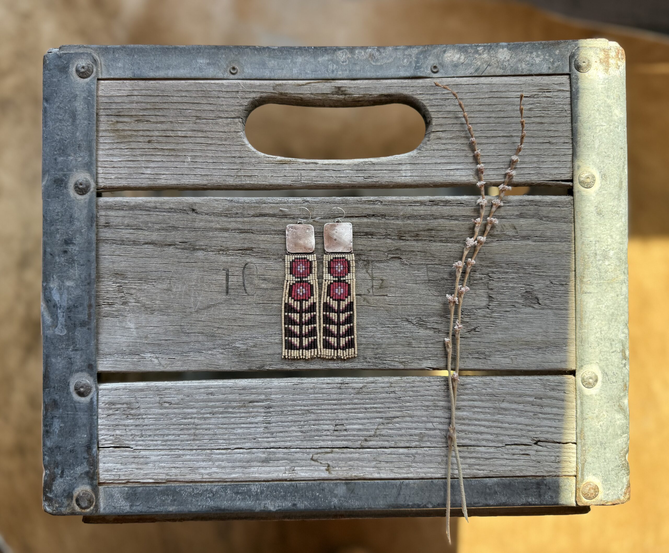 This piece is made out of size 15 Japanese glass seed beads in a folk floral patter with Fuchsia and neutral tones with a distressed sterling silver dome. These are made with black silk thread and have 24kt beads woven in.