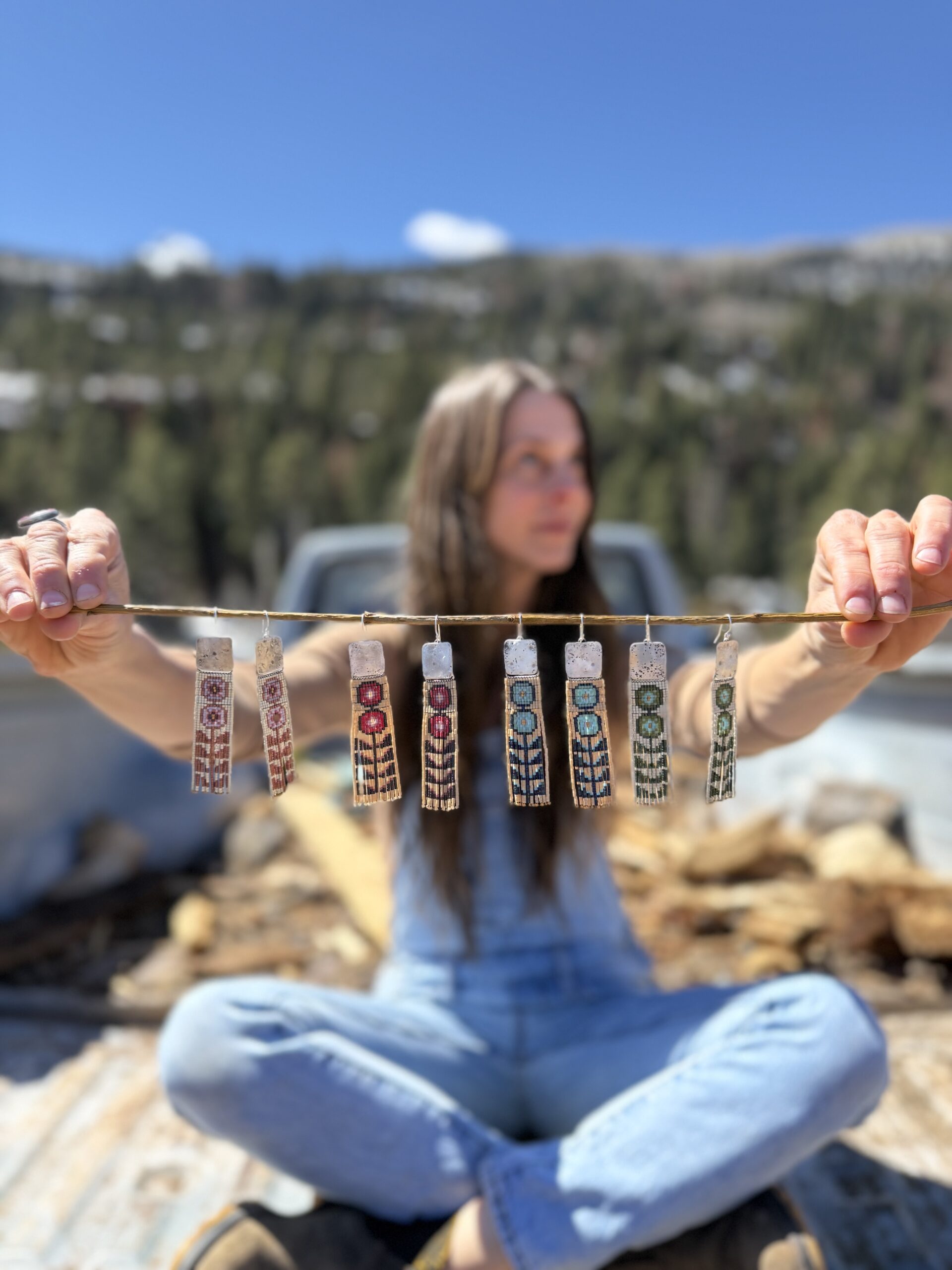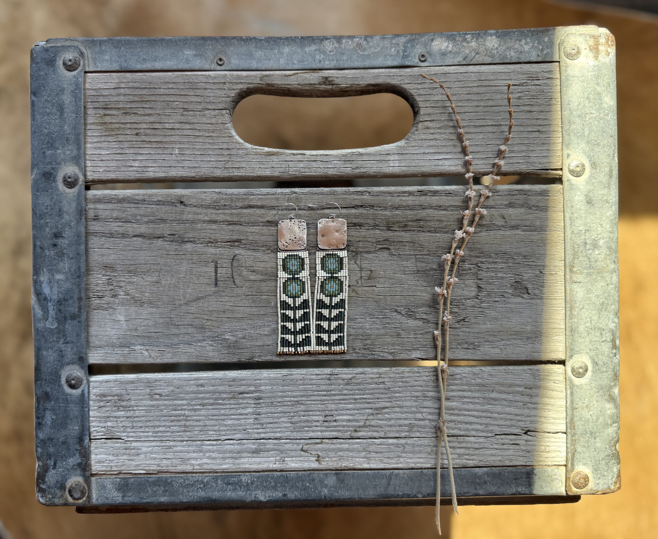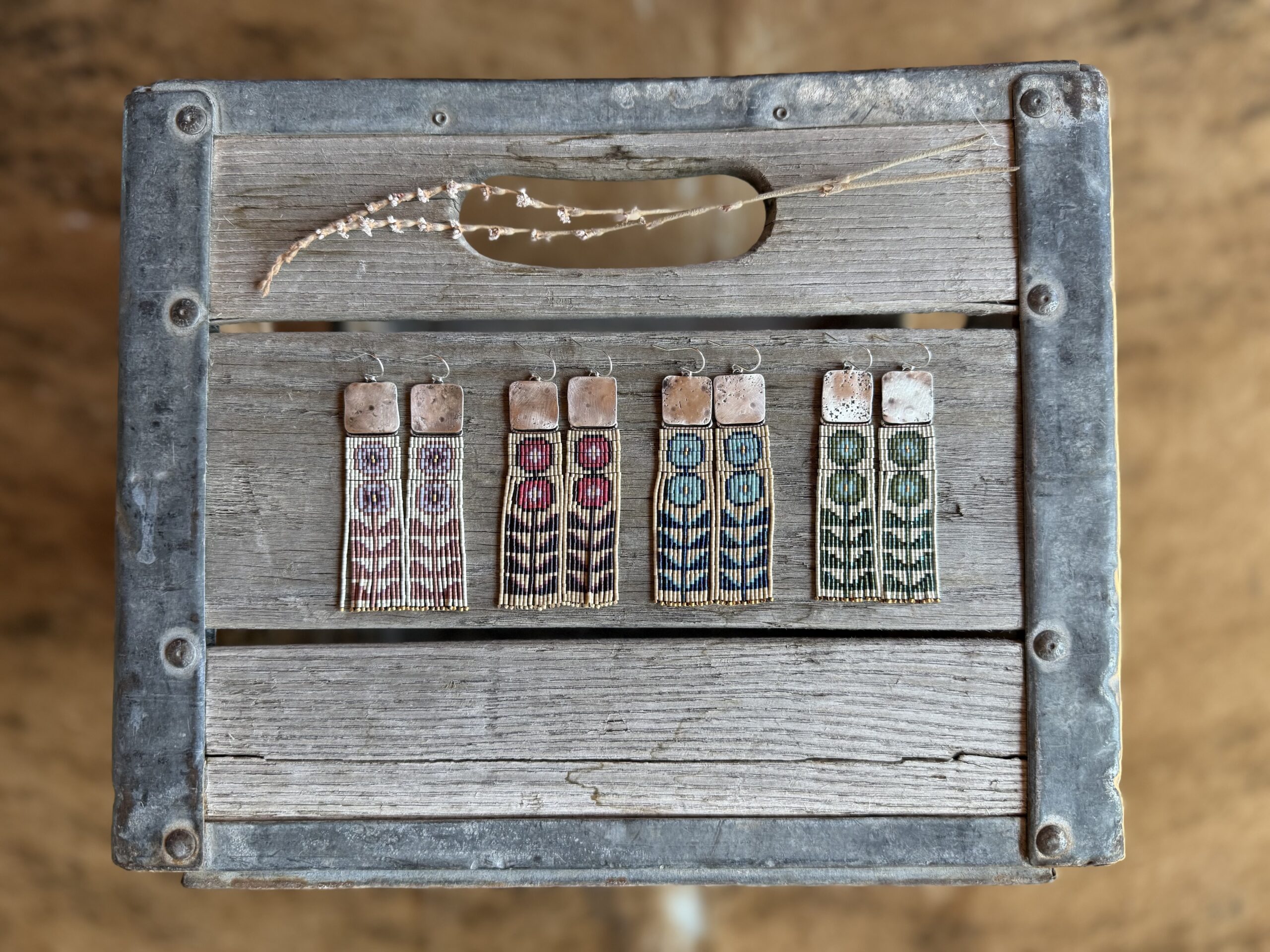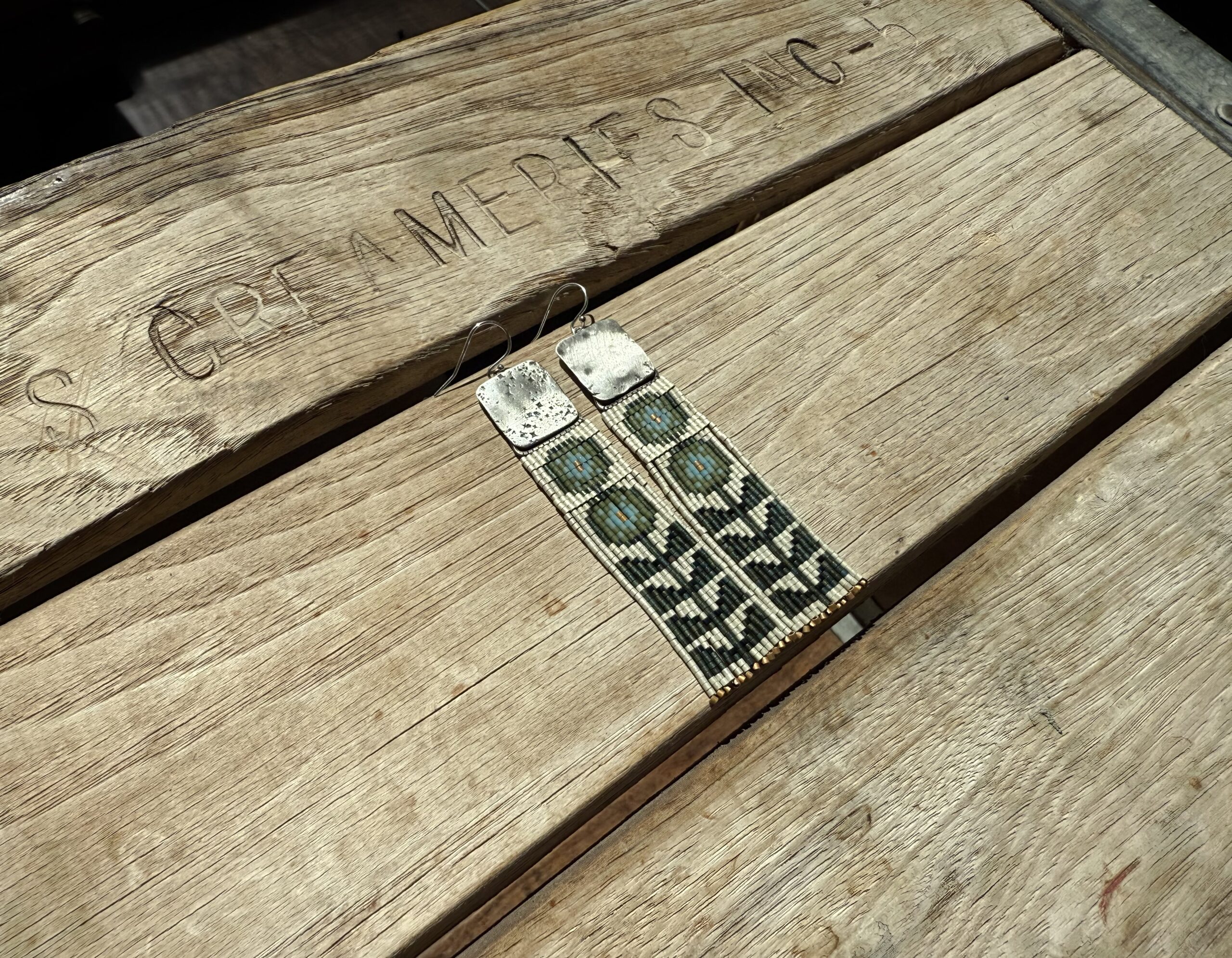 This piece is made out of size 15 Japanese glass seed beads in a folk floral patter with green and neutral tones with a distressed sterling silver dome. These are made with black silk thread and have 24kt beads woven in.