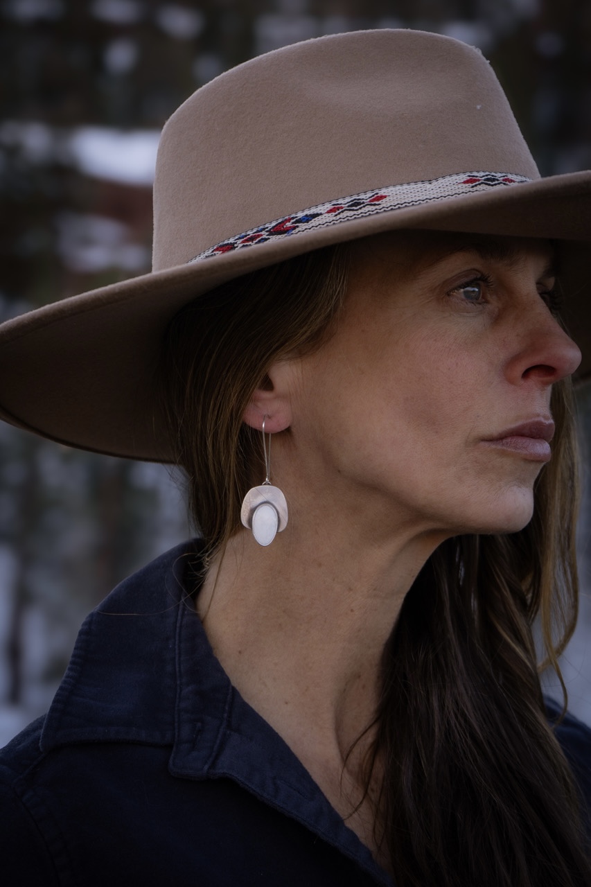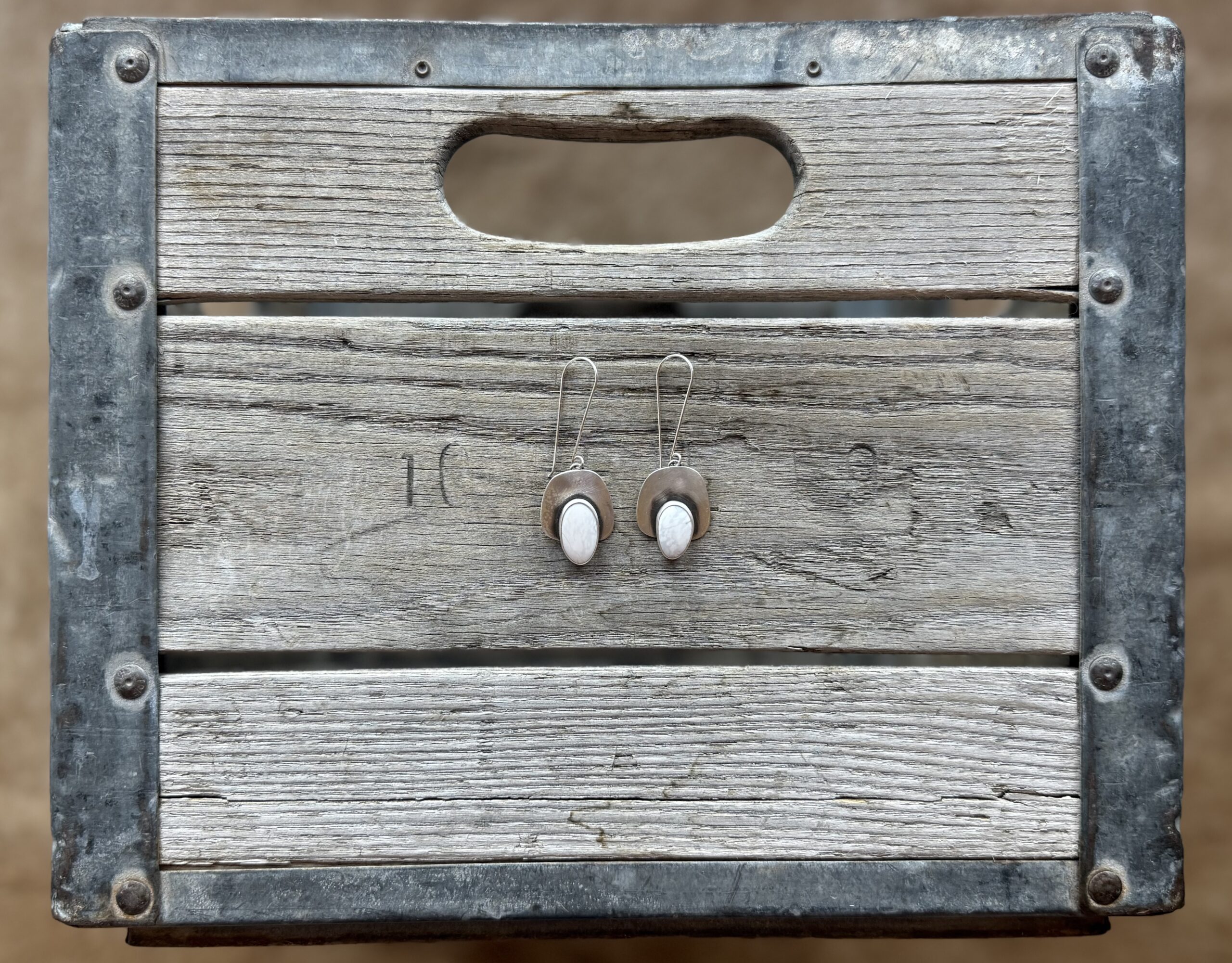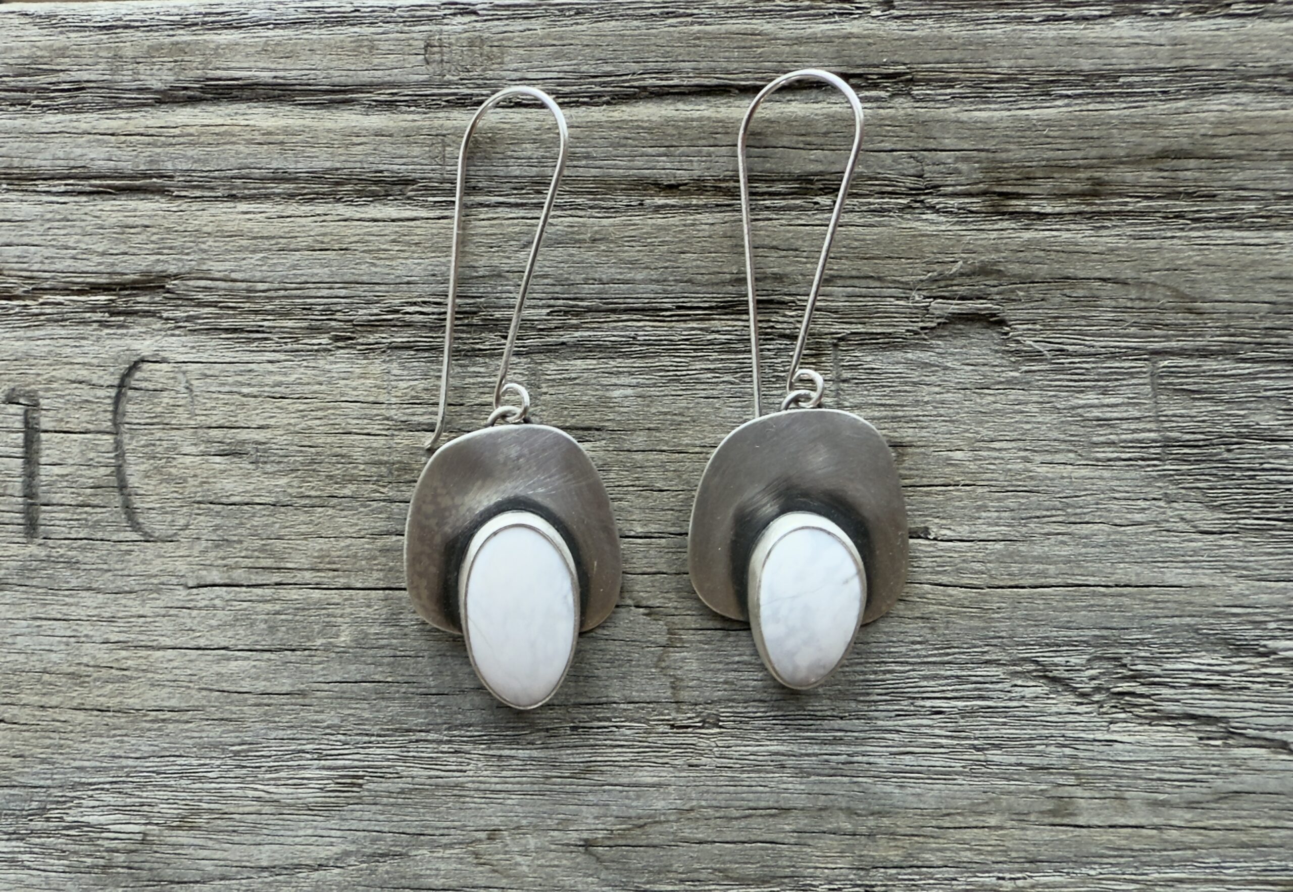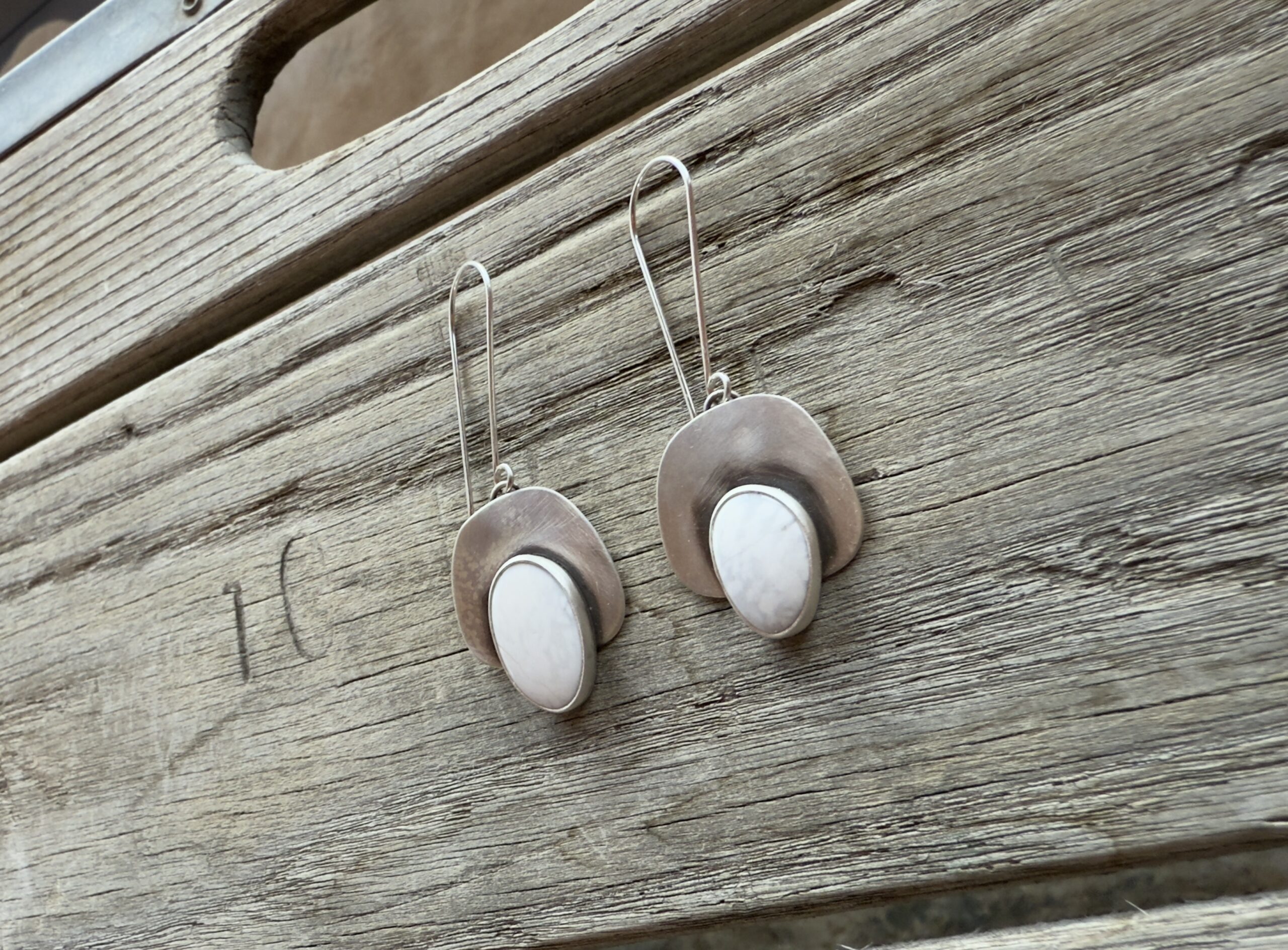 This piece is made out of sterling silver and high grade white buffalo turquoise.  These have a hand distressed silver dome with white buffalo stones.  These are 2.5 inches long and are light weight.