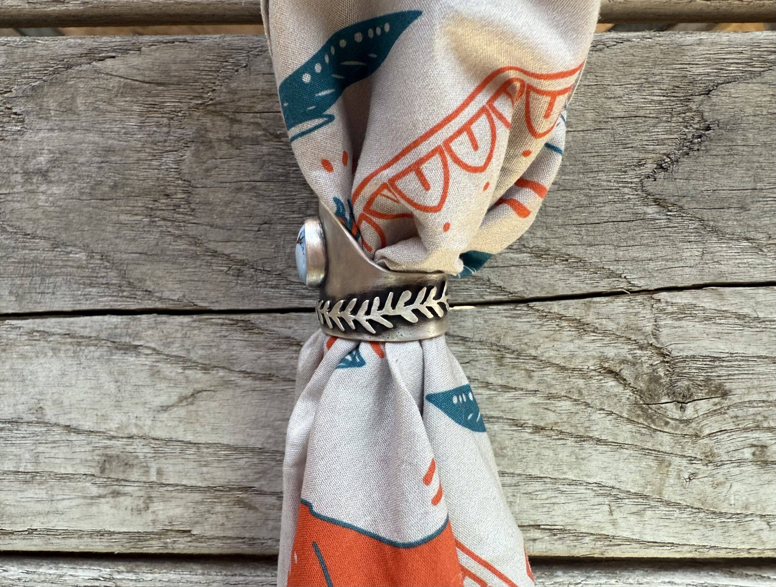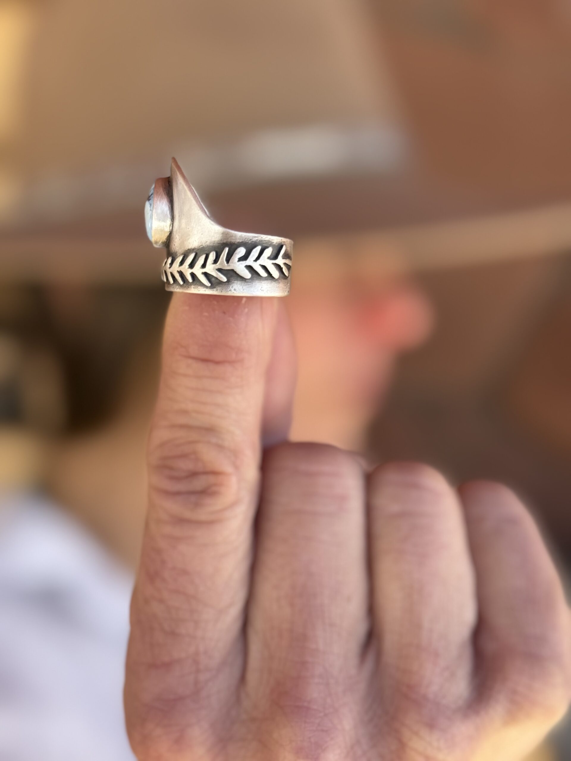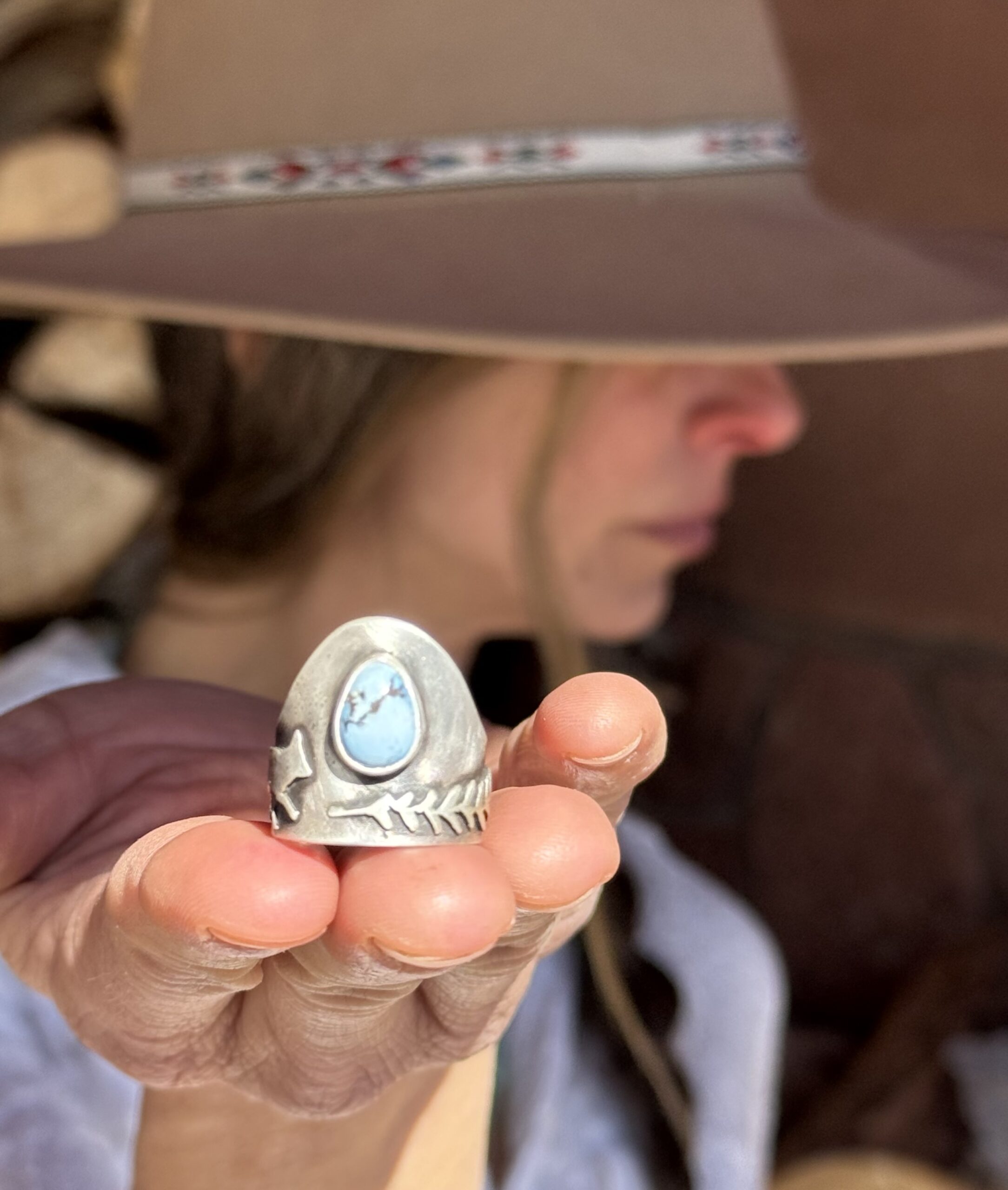 My floral rings are inspired by wild Colorado leaves and flowers in the winter that have turned into husks. They are rugged, lovely and a little brutal. These are distressed with a silver patina with multiple layers of silver to make them bold and substantial. This piece has a high grade piece of Blue Moon Turquoise cut by a lapidary artist in the US. It also has a small silver fox on band to represent the winter in the Colorado backcountry. Please note these bands are wider and have a snug fit, so you can go up a 1/2 size for comfort. This band is 21mm tall in the front and 9mm in the back.