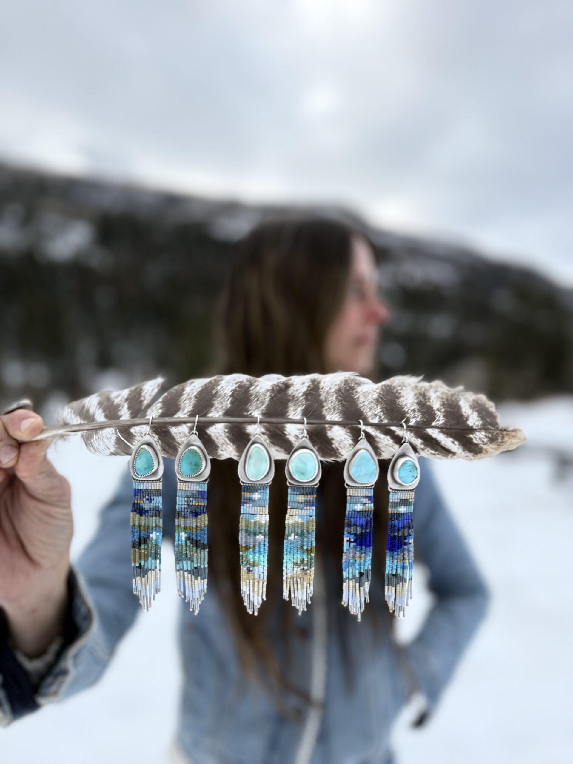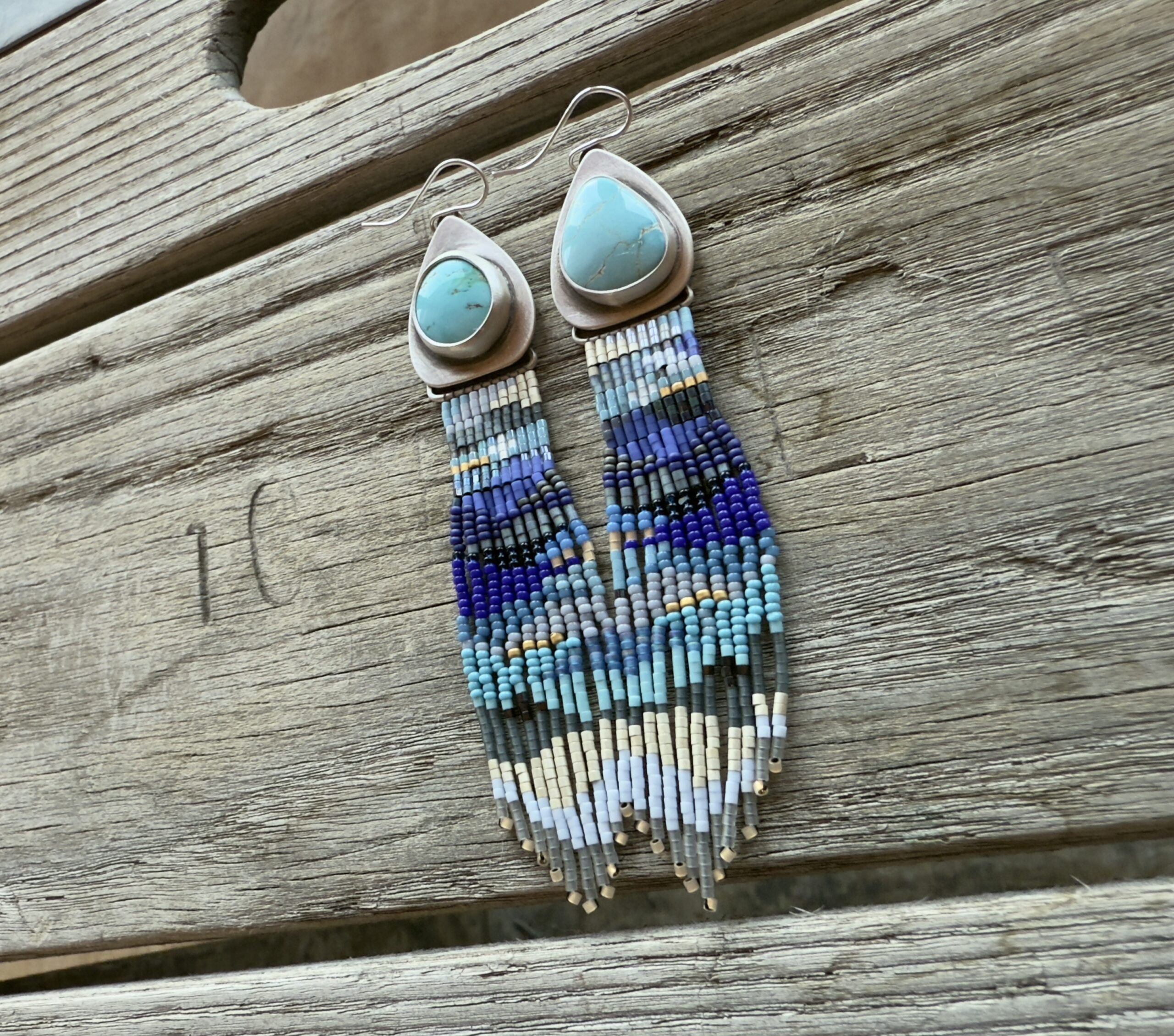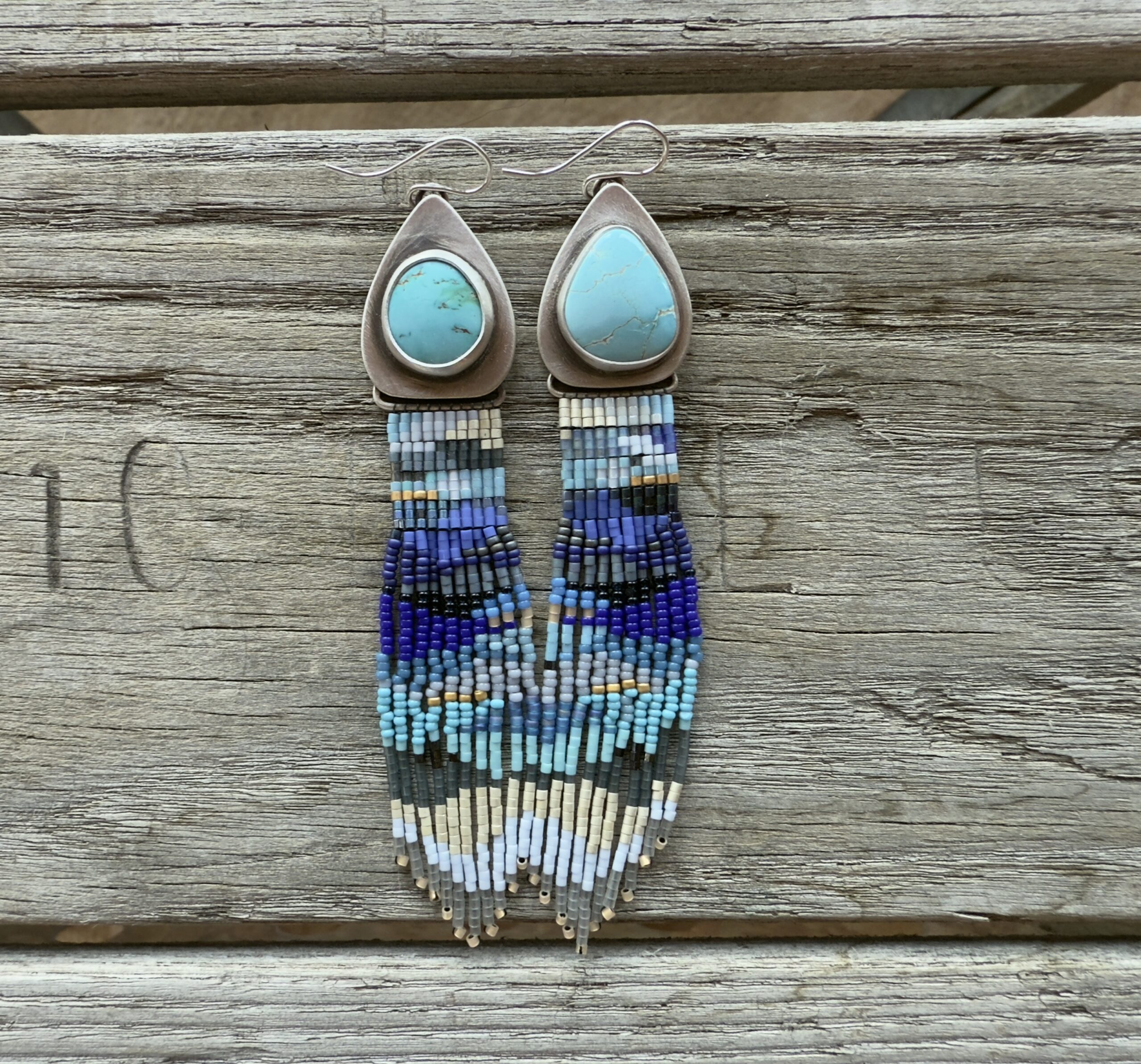 This piece is made out of size 15 Japanese glass seed beads in winter inspired tones with 24 kt bead and turquoise accents. These have a distressed silver dome with high grade Royston Turquoise stones. There are small star shaped accents throughout the beads. My work has a rustic look and feel. This is purposeful and I achieve this with using patinas, hammers, copper brushes and grit 🙂