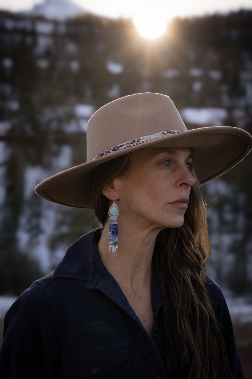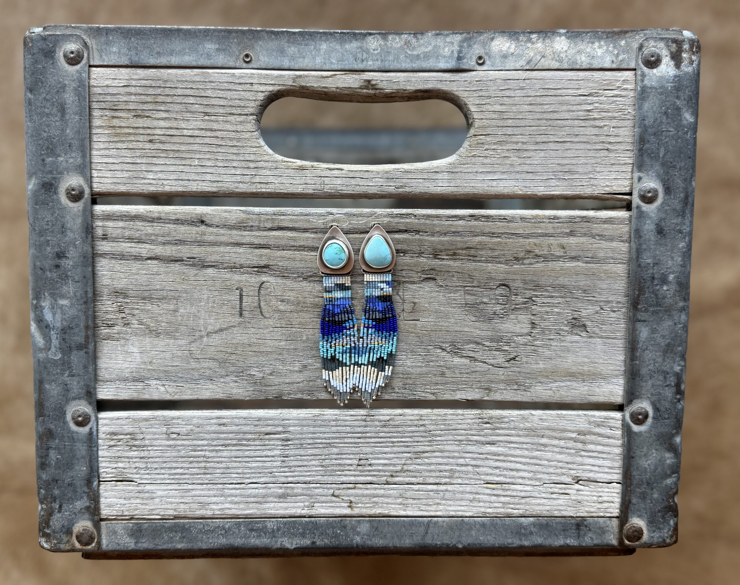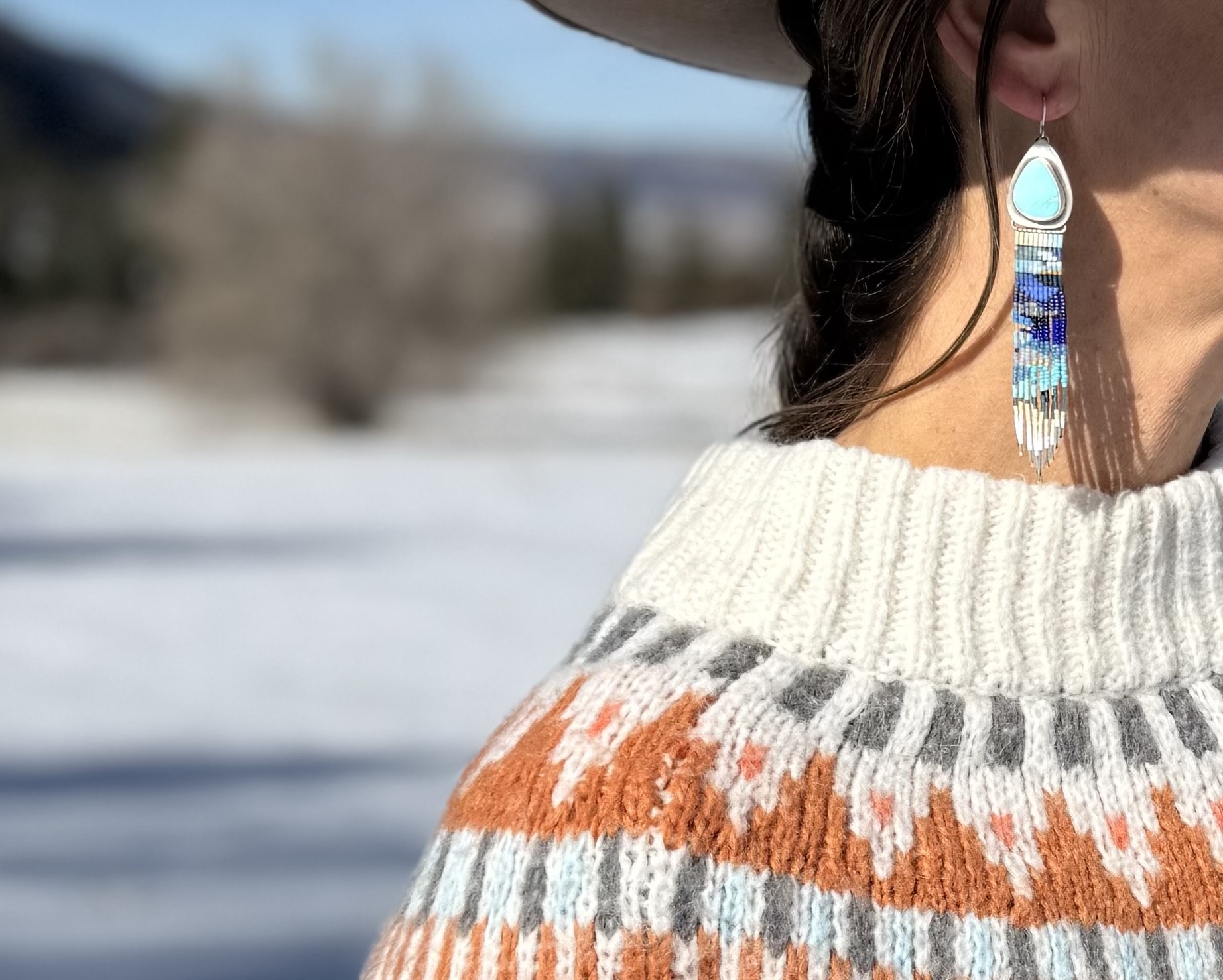 This piece is made out of size 15 Japanese glass seed beads in winter inspired tones with 24 kt bead and turquoise accents. These have a distressed silver dome with high grade Royston Turquoise stones. There are small star shaped accents throughout the beads. My work has a rustic look and feel. This is purposeful and I achieve this with using patinas, hammers, copper brushes and grit 🙂